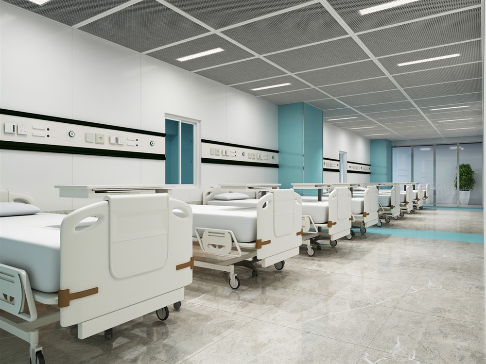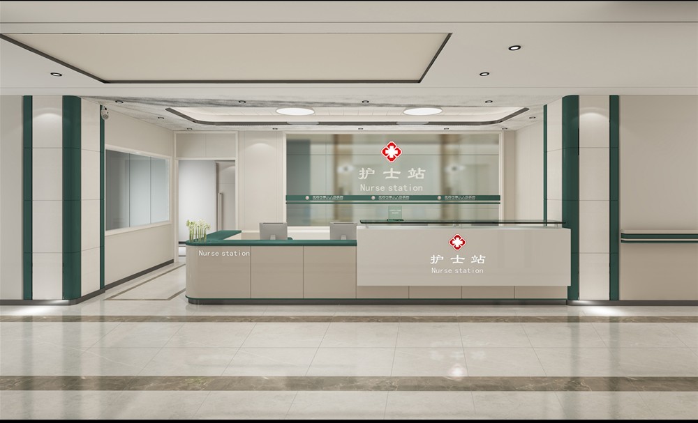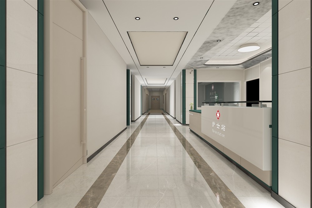 綠色代表生命力,白色代表潔凈,病房選用綠色襯托,白色為主色調(diào),地磚選用沉穩(wěn)大氣的灰色,營造一個衛(wèi)生、專業(yè)、有生命力的空間氛圍。