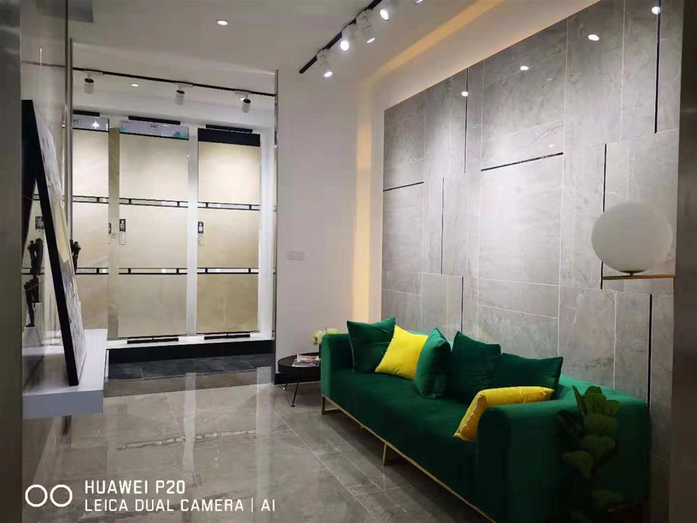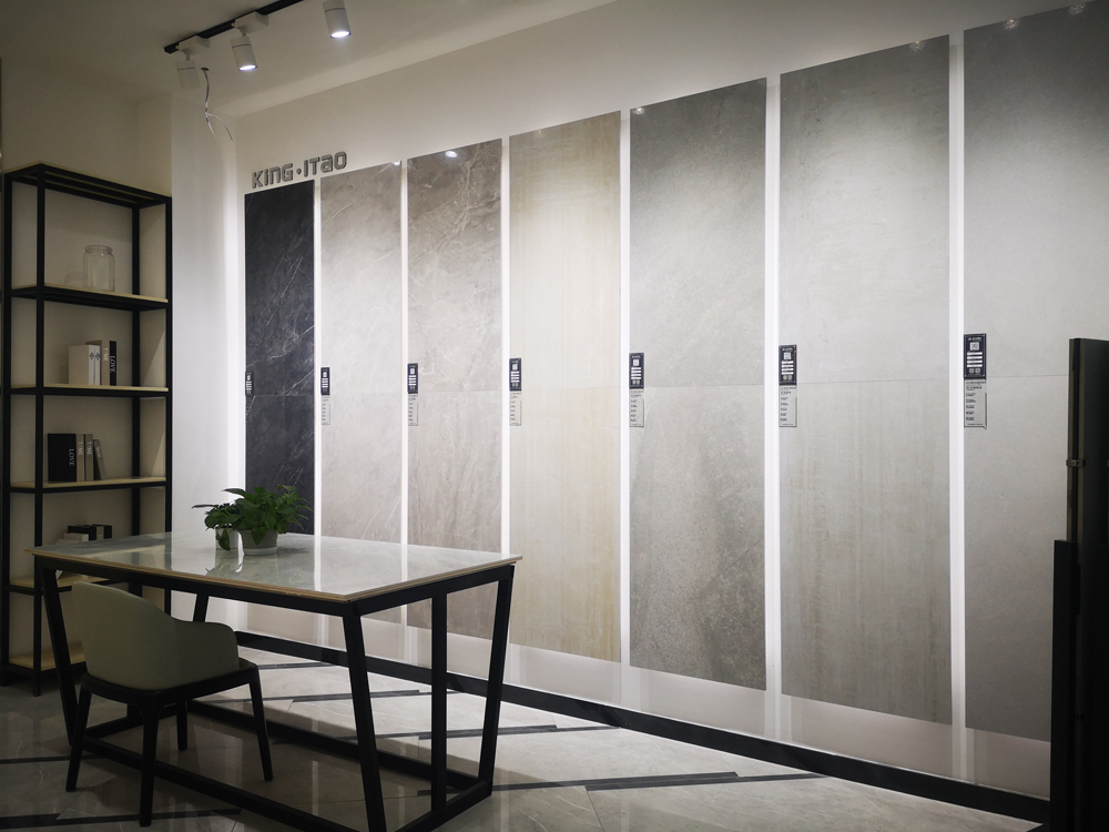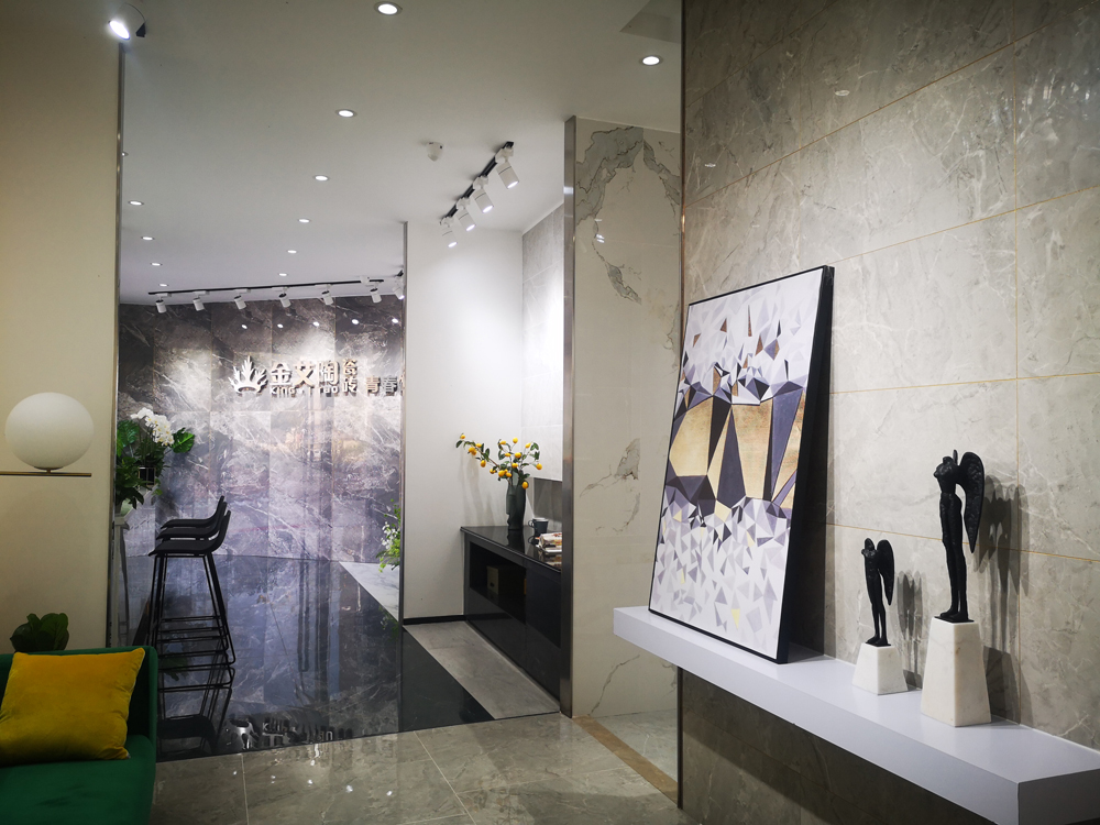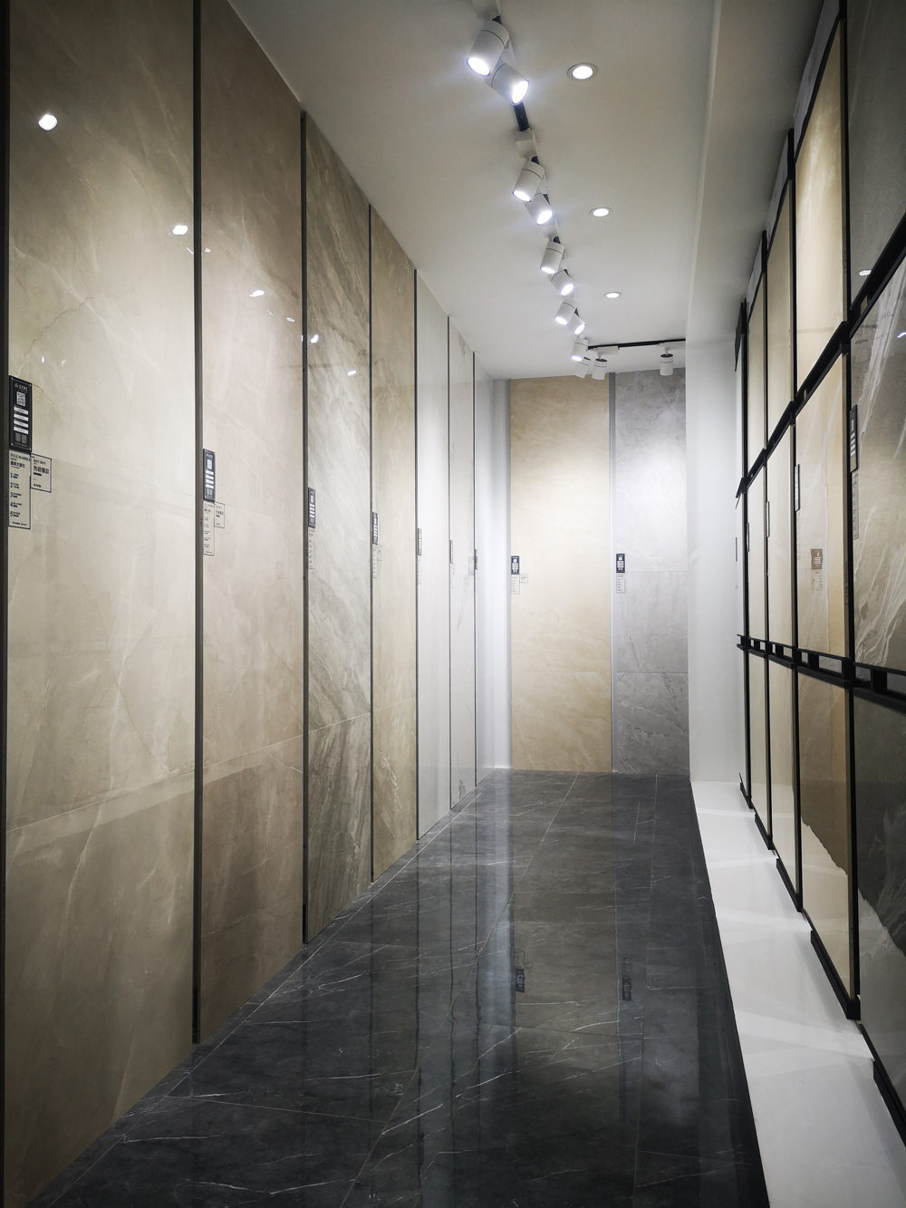 一進門是金艾陶logo的形象墻,大規(guī)格900*1800艾釉石KYP918005直鋪而成,地巖立體的畫面感,品牌:大氣、簡潔的形象表現(xiàn)得淋漓盡致。