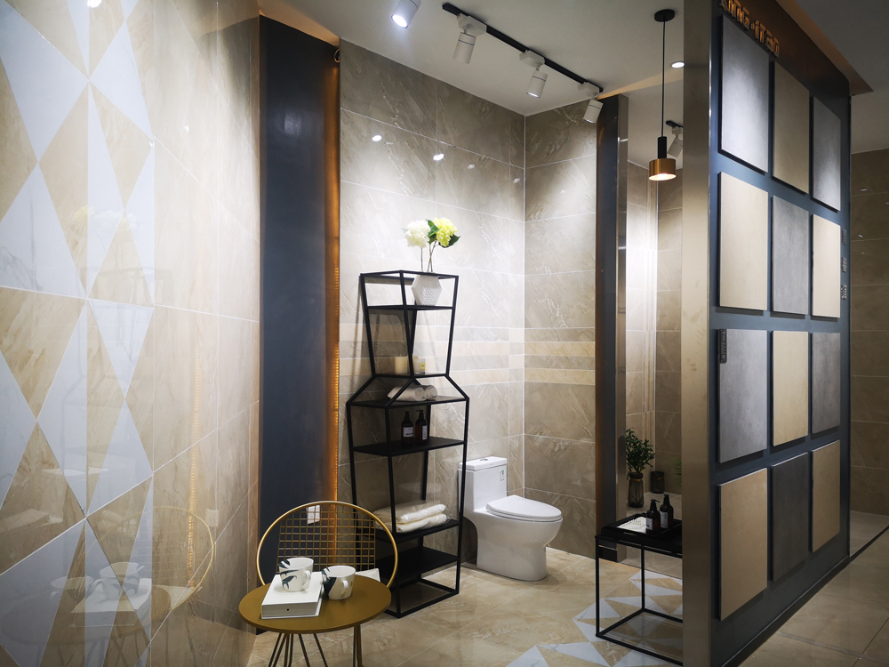 這是選材區(qū),打豎的陳列方式射燈下的產品,直觀、整潔、大氣、很好地凸顯產品的紋理,推拉陳列方式主要針對噴墨瓷片,簡單一堵墻就能把噴墨瓷片的搭配、鋪貼、風格直觀呈現(xiàn)。