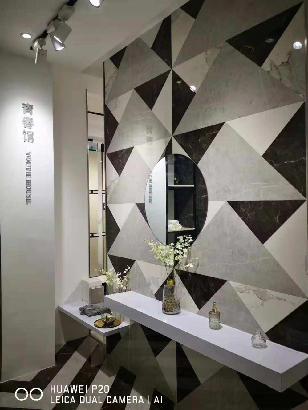 這是是由通體大理石KTA9817、KTA9818、KTA9819不同顏色不同規(guī)格三角形組合鋪貼的衛(wèi)生間,打破傳統(tǒng)的衛(wèi)生間鋪貼,搭配純白色的臺面,一繁一簡搭配不會產生審美疲勞。