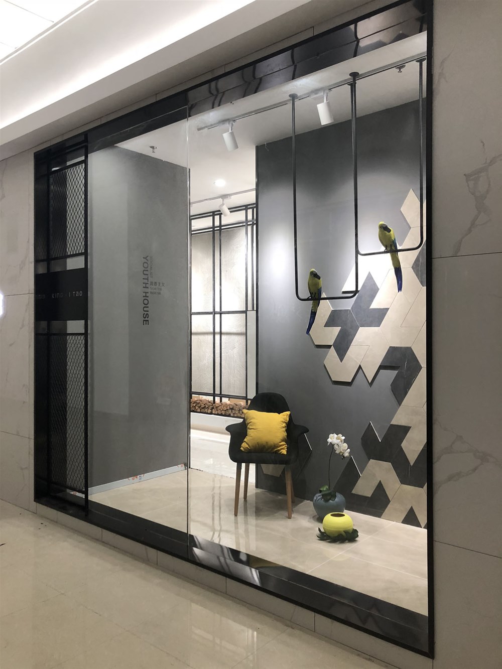 這是輕奢風(fēng)格陽(yáng)臺(tái)、書房的模擬間,由噴墨瓷片鋪貼的墻面?zhèn)€性時(shí)尚,搭配金屬軟裝營(yíng)造出輕奢的質(zhì)感?,F(xiàn)在很多流行的咖啡廳參照這樣的設(shè)計(jì)來吸引消費(fèi)者。