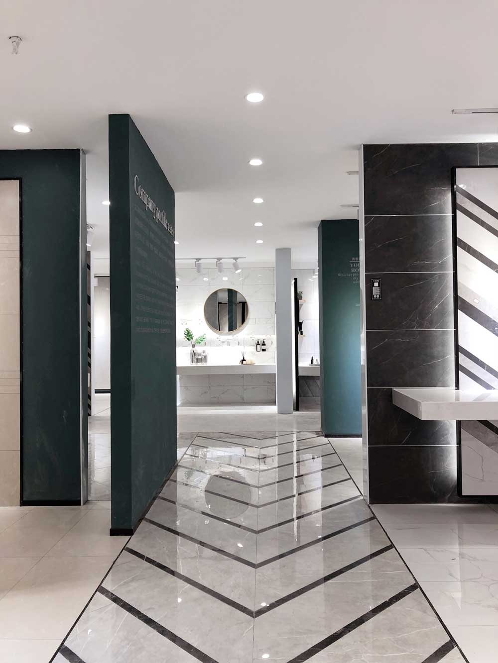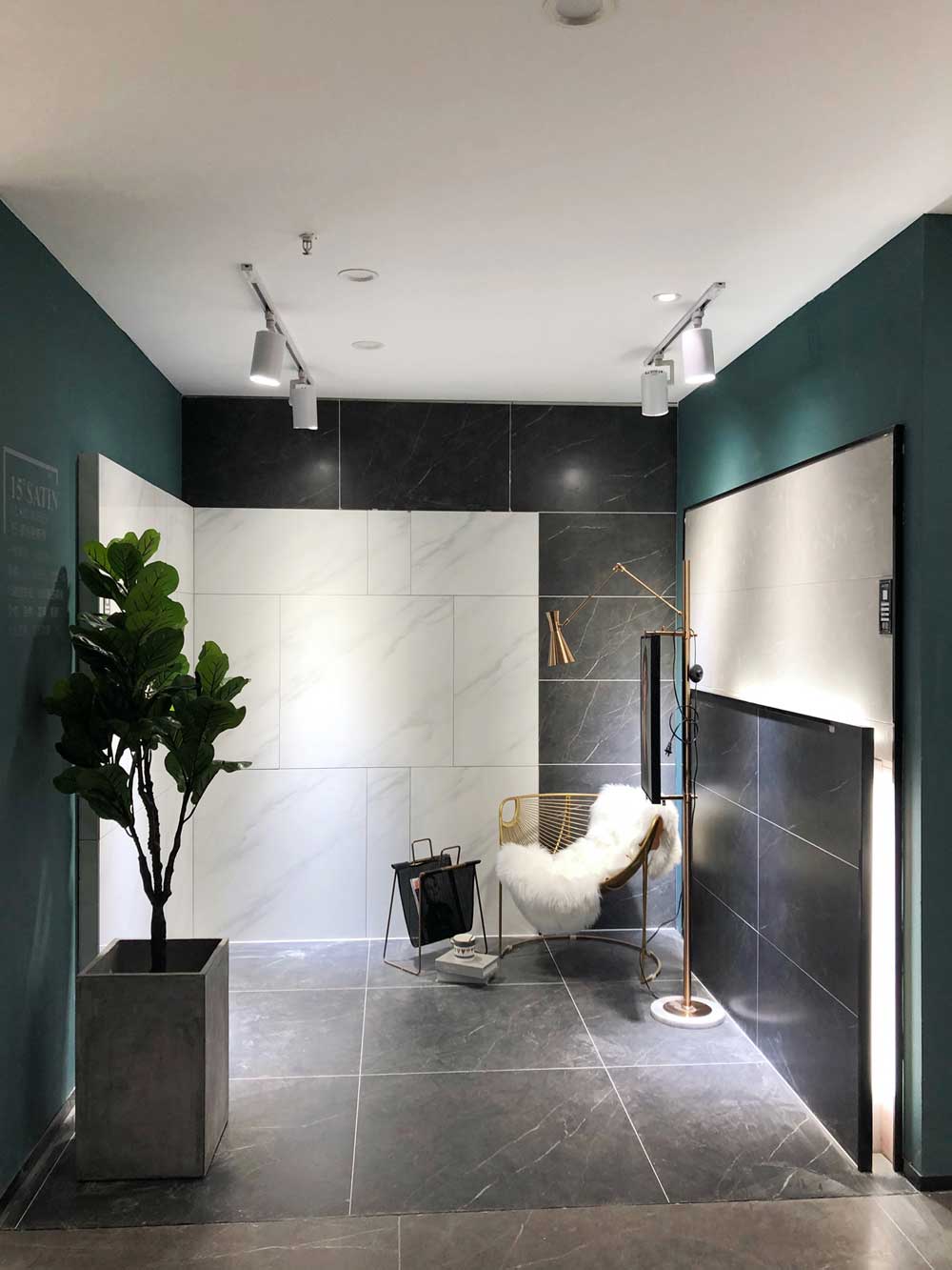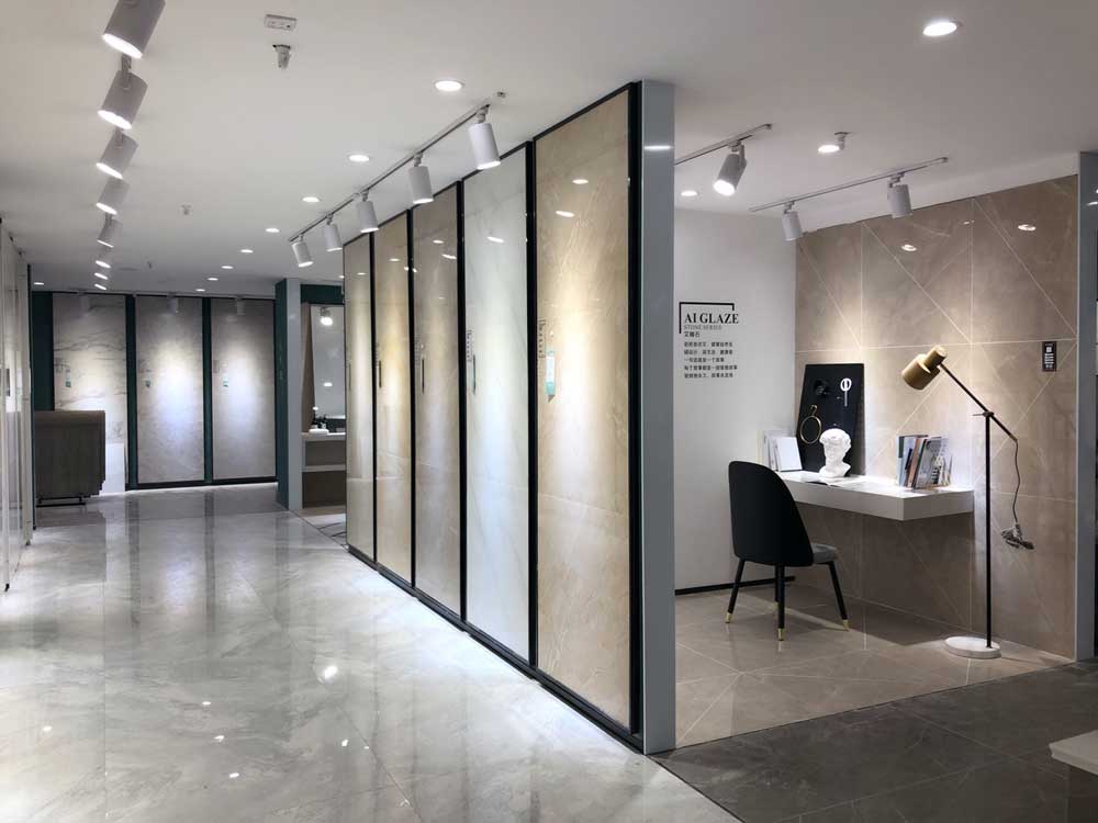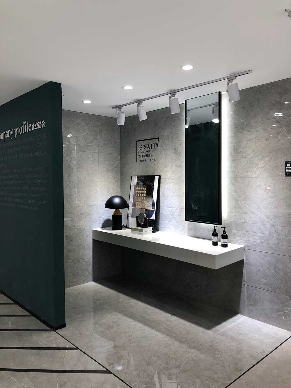 這里是我們店800x800規(guī)格產(chǎn)品的選材區(qū),通過(guò)射燈的照射下產(chǎn)品紋理是不是清晰多了?選材區(qū)過(guò)道選用淺色磚是為了區(qū)分產(chǎn)品,不至于喧賓奪主。家里裝修也要考慮好顏色搭配和空間主次哦。