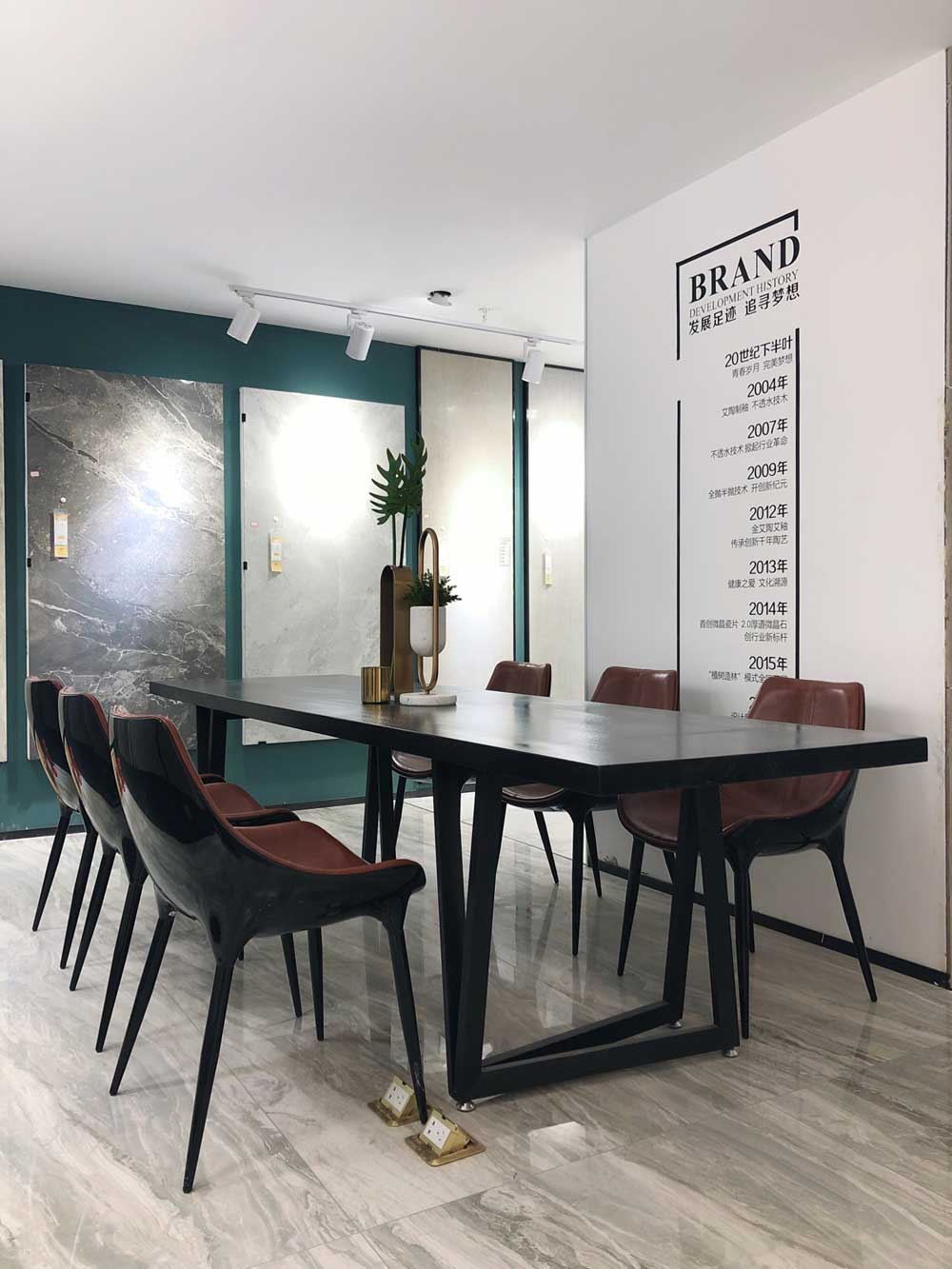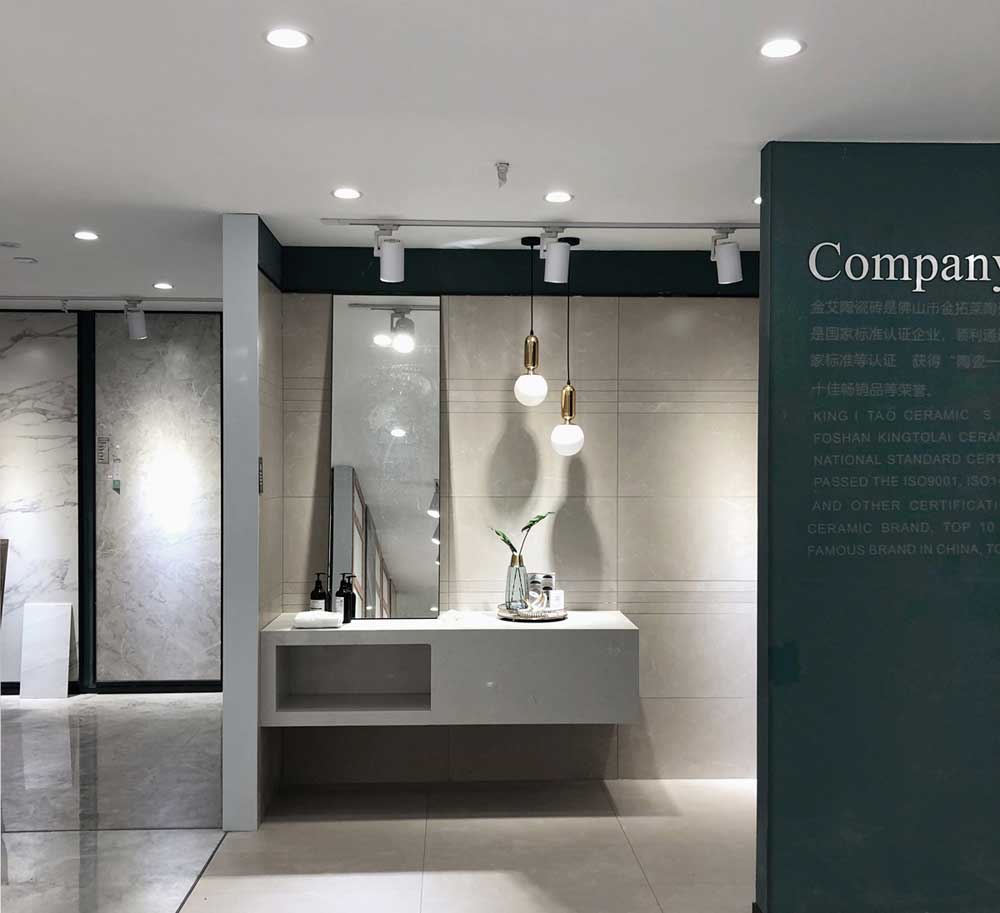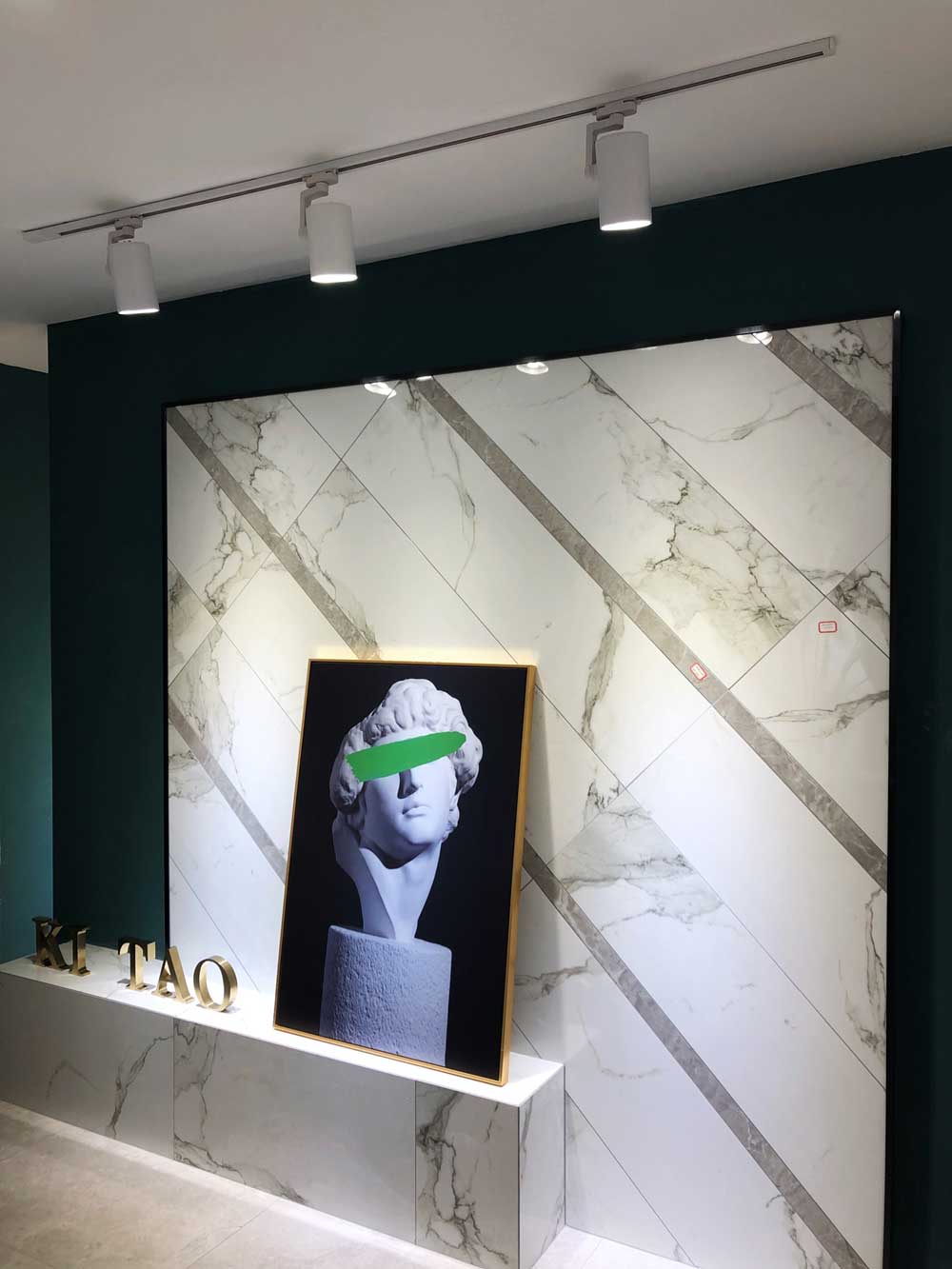 這里是我們店800x800規(guī)格產(chǎn)品的選材區(qū),通過(guò)射燈的照射下產(chǎn)品紋理是不是清晰多了?選材區(qū)過(guò)道選用淺色磚是為了區(qū)分產(chǎn)品,不至于喧賓奪主。家里裝修也要考慮好顏色搭配和空間主次哦。