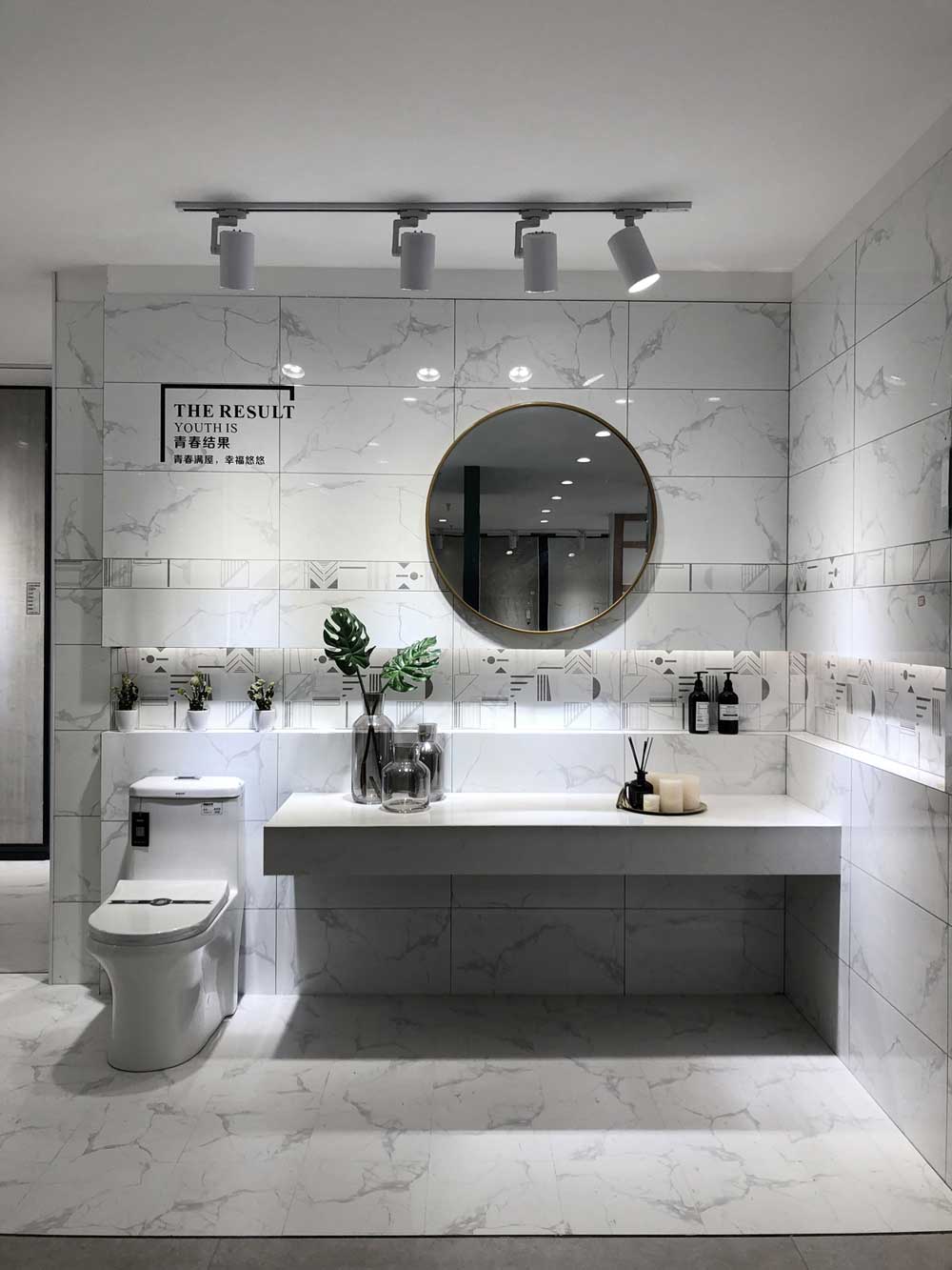 這個(gè)輕奢衛(wèi)生間選用的是噴墨瓷片KPM36088的配套產(chǎn)品,面積雖小,但看上去是不是挺寬闊明亮的?這就是白色磚的優(yōu)點(diǎn),且衛(wèi)生間通常比較潮濕,選用白色磚給人潔凈明亮的感覺(jué)。使用感非常舒適。