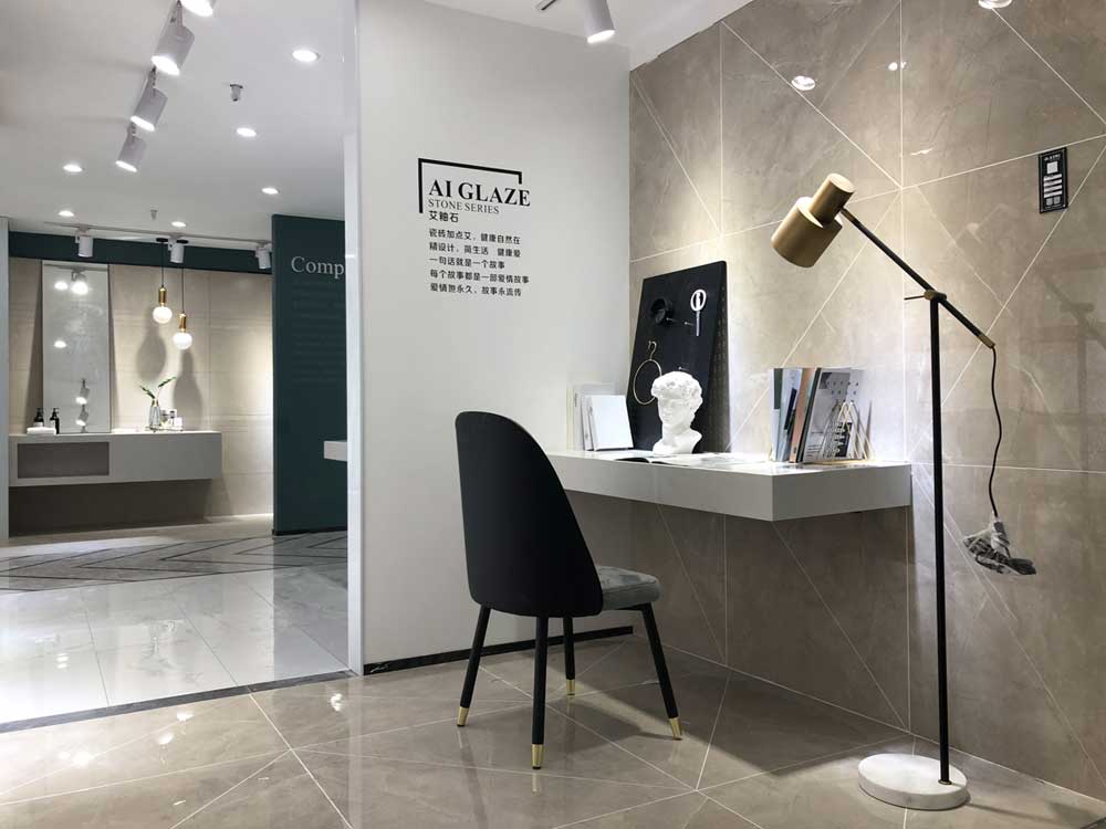 這是現(xiàn)代簡(jiǎn)約書(shū)房的模擬間,鋪貼的是艾釉石KYP8118潘多拉灰,艾釉石是我們店里的明星產(chǎn)品,同行人都知道我們的磚釉面比別人亮,耐臟耐磨,因?yàn)槲覀冇凶约旱挠粤瞎?,自主研發(fā)釉料。再說(shuō)灰色磚給人安靜的感覺(jué),書(shū)房選灰色就沒(méi)錯(cuò)了。