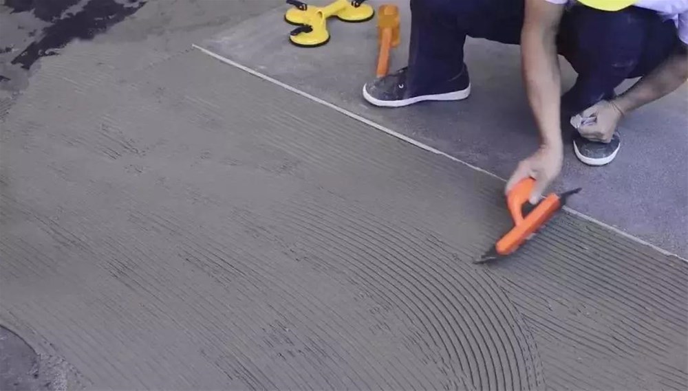在地面均勻鋪上一層瓷磚膠,形成半干的一層,再次用瓷磚膠填平表面凹凸處,厚度為0.5CM左右;適當(dāng)條件下,可同時(shí)將瓷磚膠均勻地抹在瓷磚背面,要求瓷磚膠涂抹飽滿。