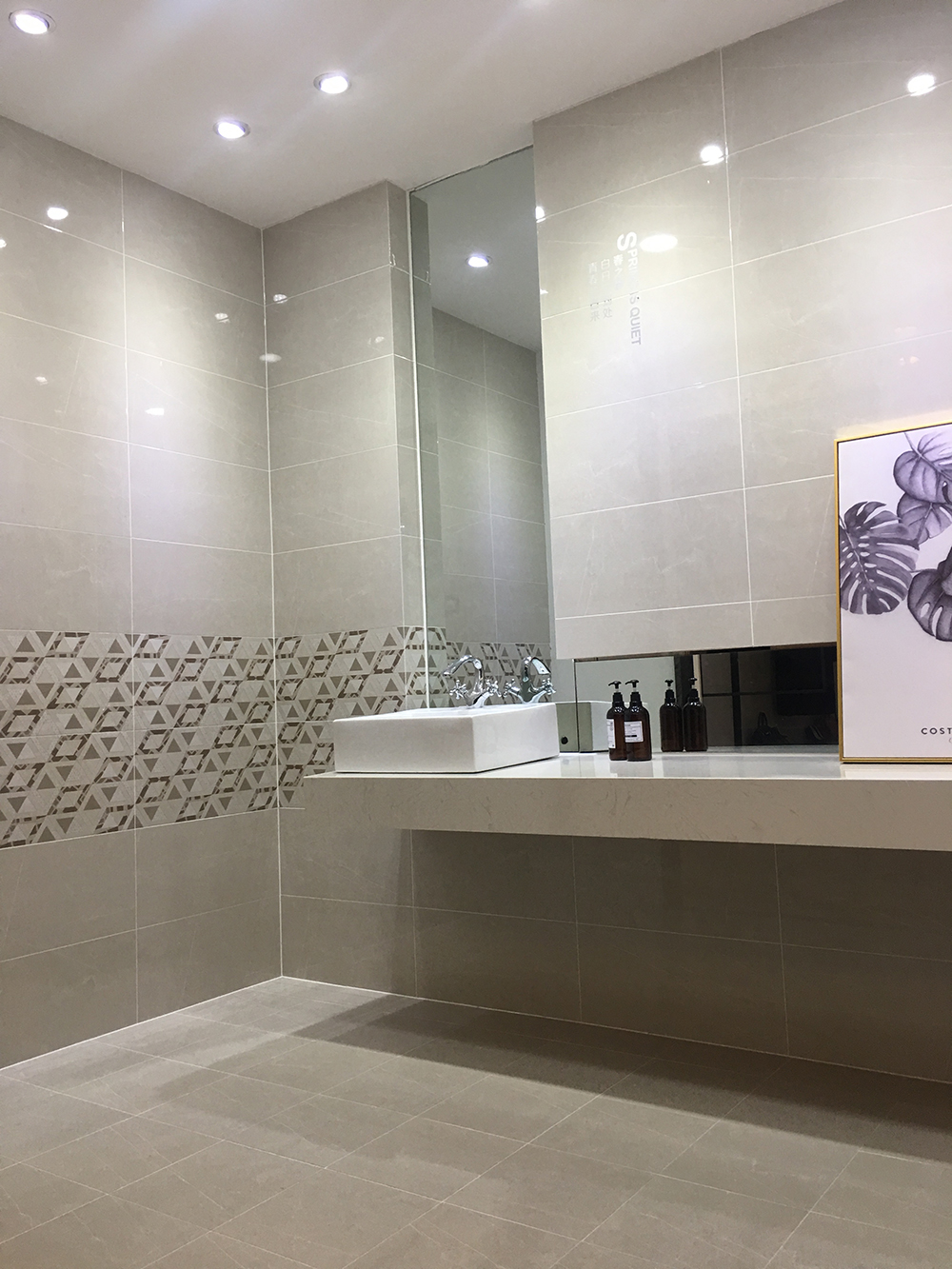 衛(wèi)生間墻面由三個(gè)層次的灰色拼接