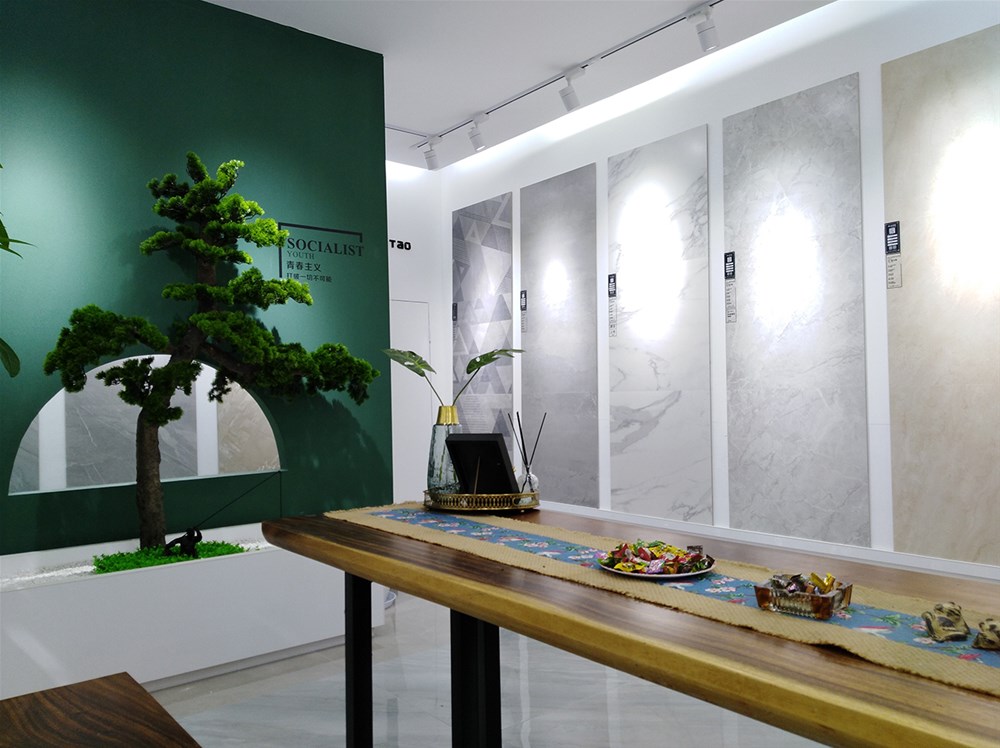 這邊走就是我們的選材區(qū),我們品牌主打規(guī)格有300*300、300*600、150*900、800*800、600*1200、900*1800等,15°護(hù)眼緞光釉系列、亮面通體大理石、健康艾釉石、現(xiàn)代仿古磚、配套噴墨內(nèi)墻磚一應(yīng)俱全,每一款花式獨(dú)特且耐看,滿足全屋用磚要求。