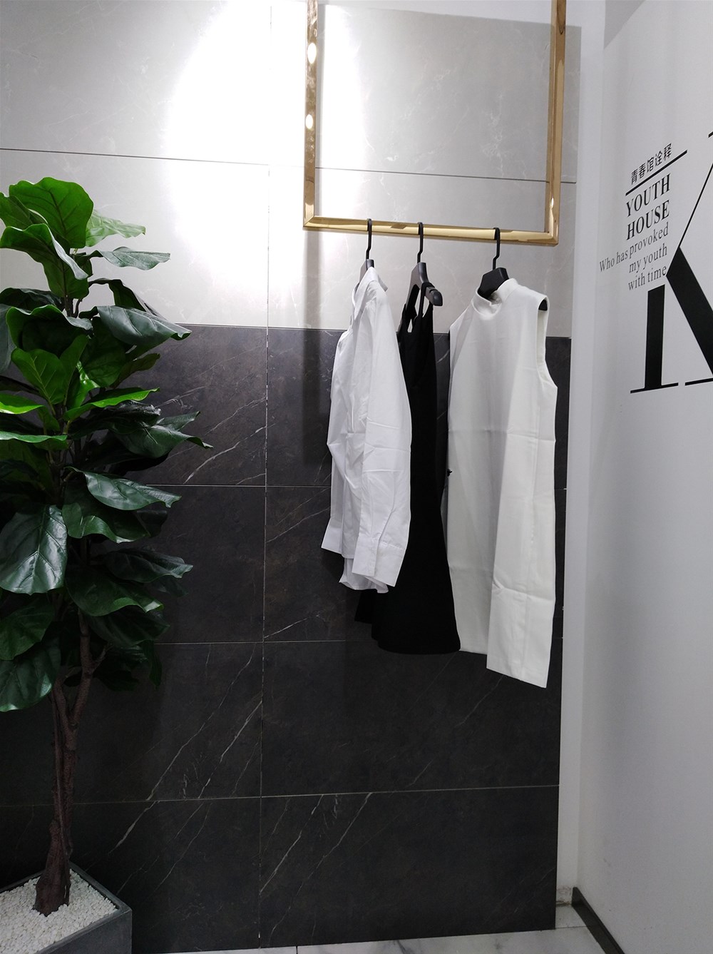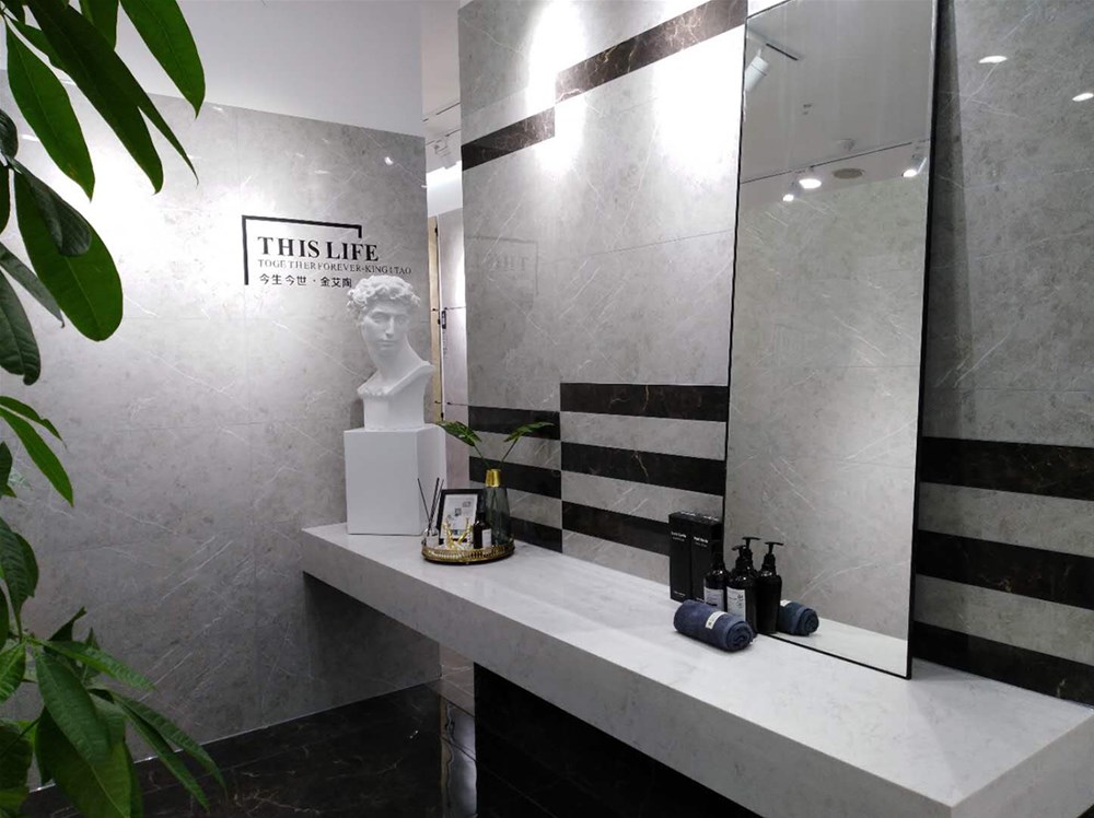 這是前臺(tái)接待區(qū),背景墻選用網(wǎng)紅規(guī)格600*1200mm尼泊爾灰KA9M61209通鋪,簡(jiǎn)潔中不失優(yōu)雅的一款灰色調(diào)瓷磚,這款產(chǎn)品鋪貼到你家電視背景墻、客餐廳地磚同樣適合。不知道您覺(jué)得怎么樣?