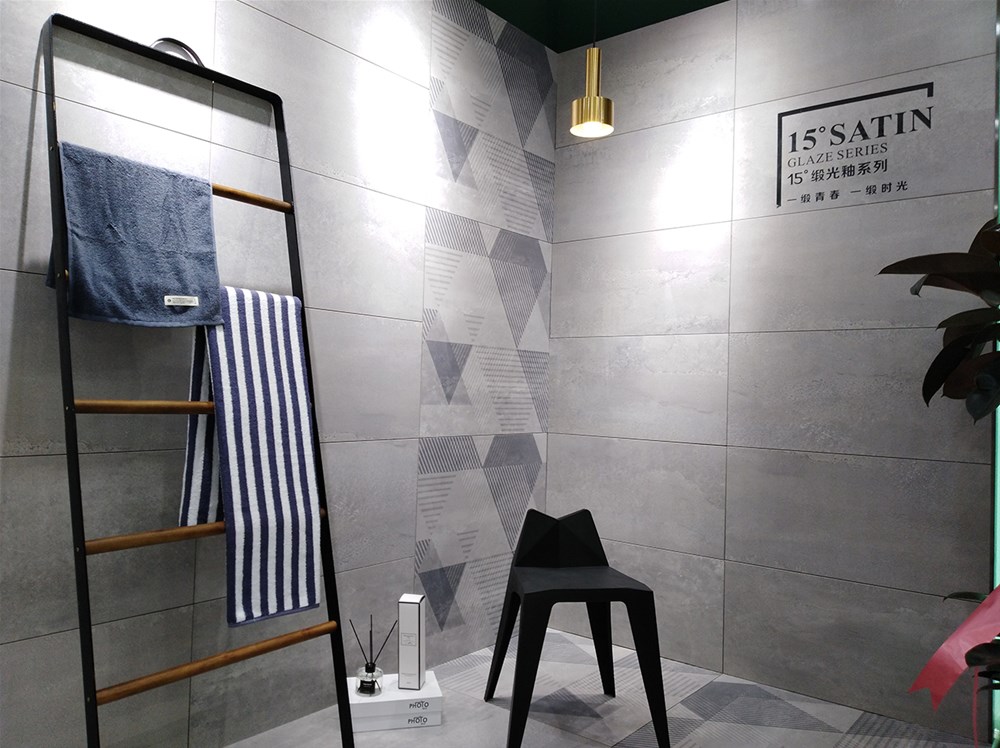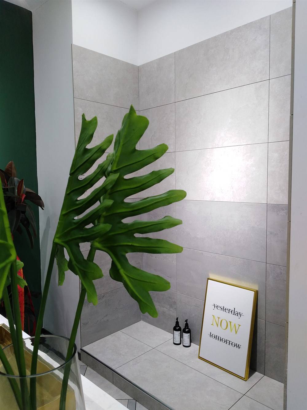 這是由15°緞光釉KFD8805奧斯曼灰與KFD8806銀線灰洞加工成400*800規(guī)格拼鋪的現(xiàn)代簡(jiǎn)約衛(wèi)生間,深與淺的過(guò)渡,磚面紋理斑駁,散發(fā)出復(fù)古的氣息,作為衛(wèi)生間用磚不僅耐臟且起到很好防滑作用。用到陽(yáng)臺(tái)、廚房等區(qū)域同樣能完美綻放。