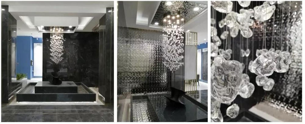 入口大堂入眼就是一個(gè)中央景觀形象區(qū),選用黑色的大理石搭配晶瑩剔透的瀑布水晶燈,璀璨奪目,高級(jí)感一下子提升上來