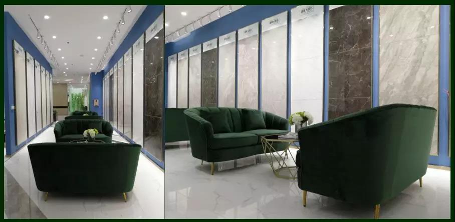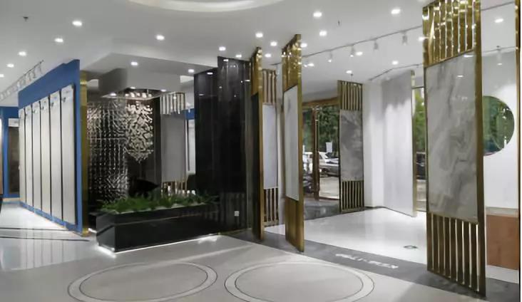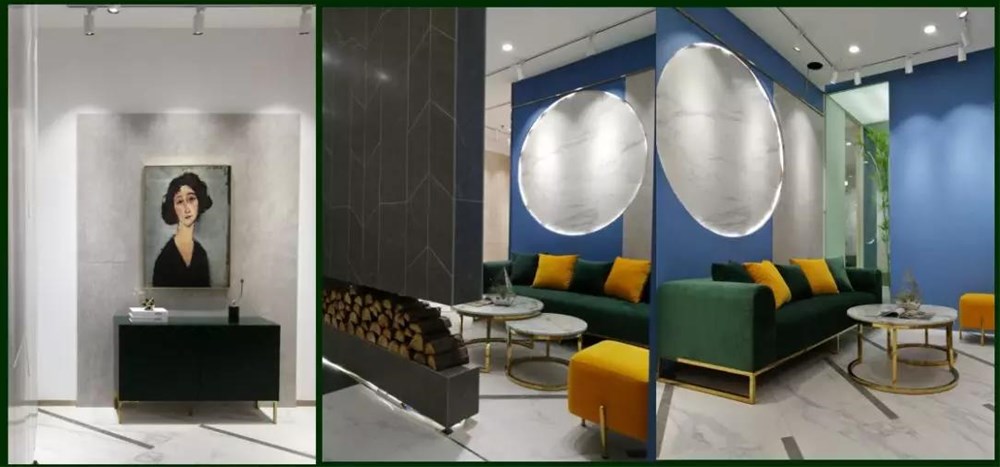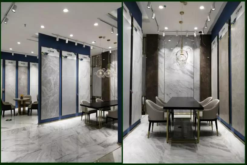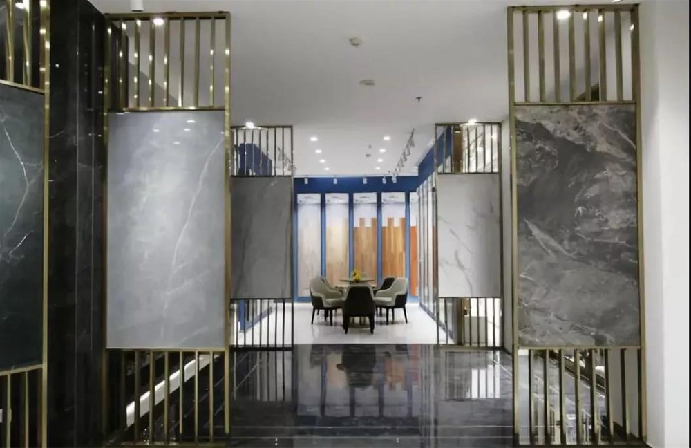 900*1800的大板以屏風(fēng)的形式展現(xiàn),不但很巧妙的體現(xiàn)了大巖板系列產(chǎn)品的紋理和設(shè)計(jì)感,而且通過系列的屏風(fēng)展示很巧妙的把大堂區(qū)域兩邊劃分為接待區(qū)和洽談區(qū),靜/動(dòng)兩個(gè)區(qū)。