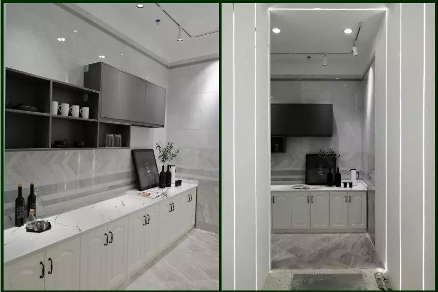 800*800樣板展示區(qū),以色彩置為參照?qǐng)A點(diǎn),延伸出了以雪白而略帶灰度的空間基底,帶有肌理感的瓷磚樣板,用顏色和亮度的不同,區(qū)分空間的層次;結(jié)構(gòu)線條和香檳金鋼條陣列相間,對(duì)于金屬紐帶的回應(yīng),穿插在空間的每一個(gè)小細(xì)節(jié)中;