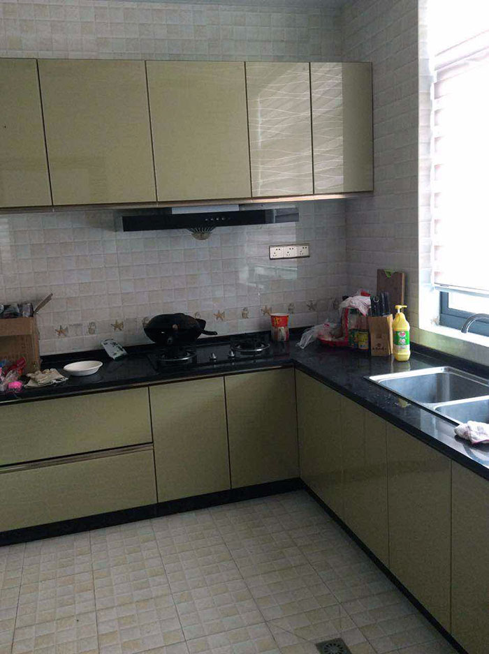 櫥柜以當(dāng)下流行的土豪金色為主色調(diào),臺面選用黑色大理石,高端、大氣!地面鋪貼金艾陶內(nèi)墻磚KPA36057系列,易于打理的同時(shí)又可呈現(xiàn)出如馬賽克般的美感,精美絕倫。