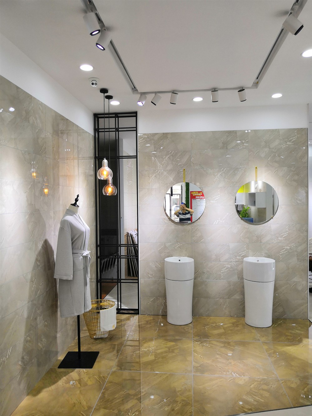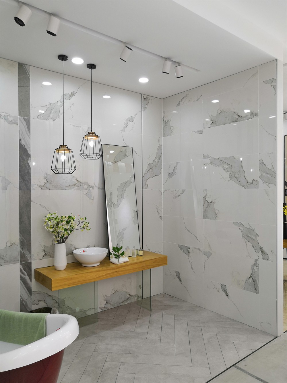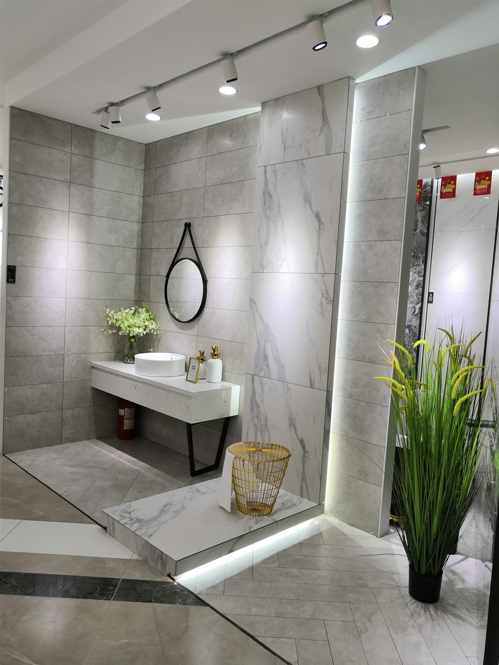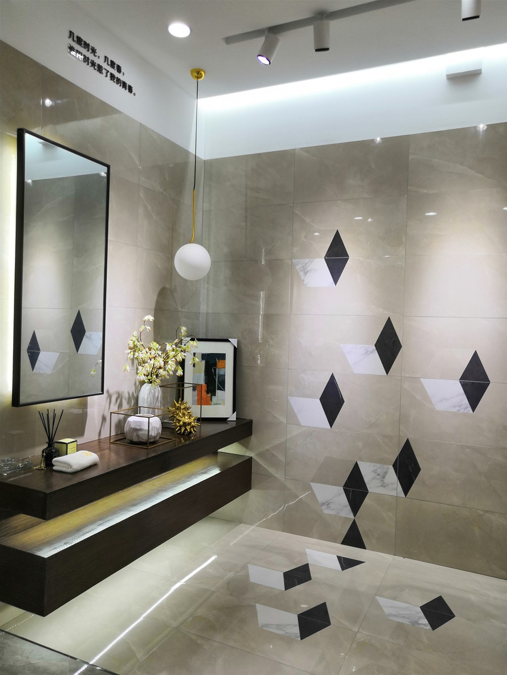 墻面用的是我們的15度緞光釉卡拉卡白(KFD8801)和九面通體大理石羅馬砂巖(KA9M001)