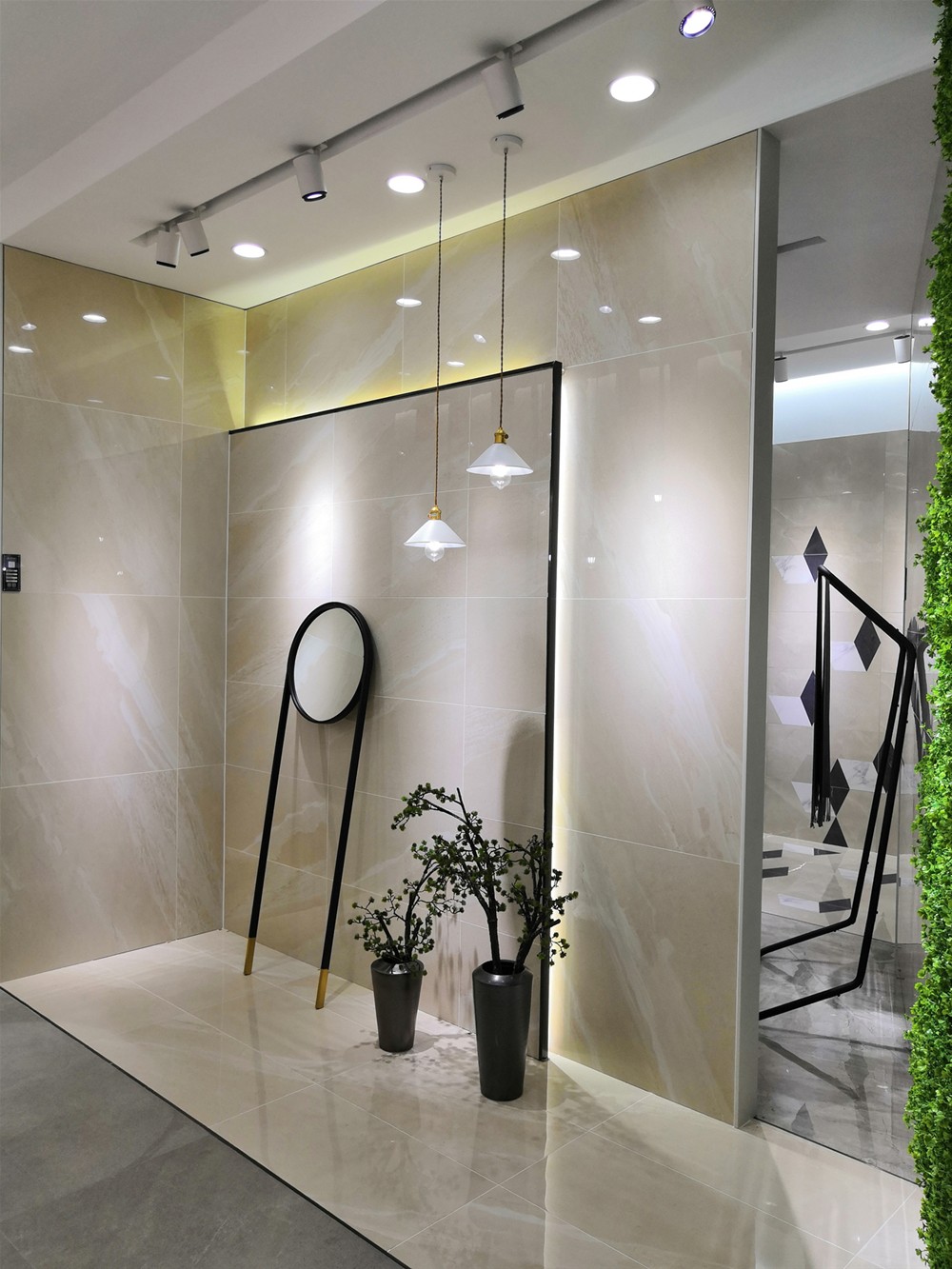 8805是灰色素紋理,8801是淺色大紋理,從設(shè)計上考慮,8805適合大面積使用,8801則作為焦點鋪貼。地面則以木紋磚的鋪貼方式,給產(chǎn)品更多可能性。墻面采用大膽的266鋪貼,使整個墻面更加修長,在視覺上給狹窄的店面增加寬廣感!