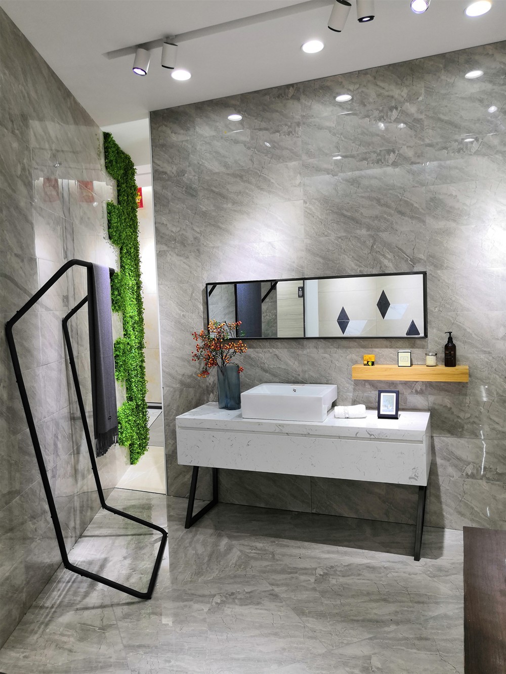 這款產(chǎn)品是灰色調(diào)大紋理,從設(shè)計考慮是不宜做太多的鋪貼手法或者水刀。因為紋理足夠豐富,我們只采用400*800直接純色上墻,這樣就把產(chǎn)品的特性表現(xiàn)最極致。